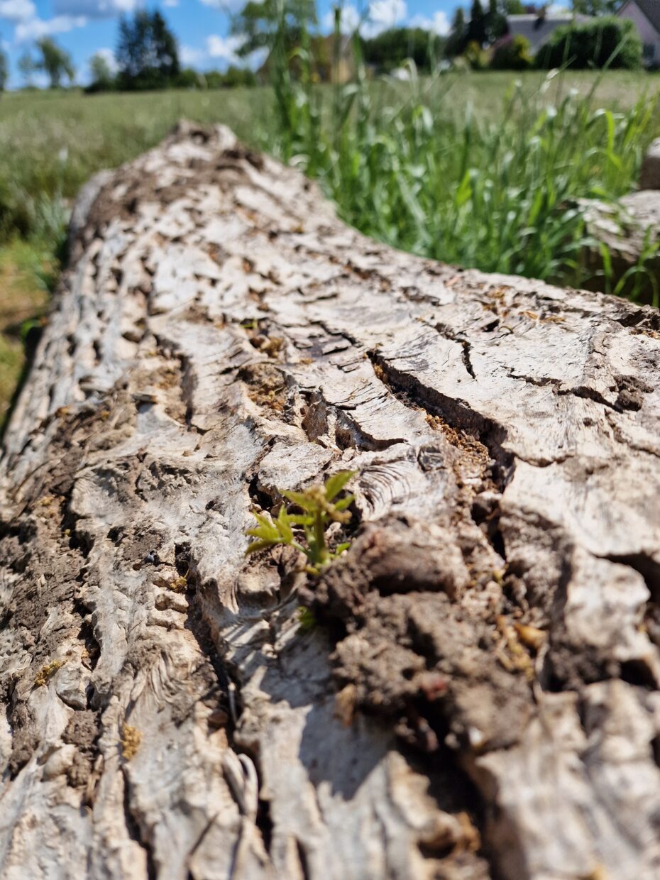 Jeg bliver gang på gang imponeret over naturens kraft. Græsset vokser, træer og buske står frodige og grønne – men det, der virkelig rørte mig, var denne store kastanje. Den blev fældet for tre år siden og har siden ligget henslængt på en mark. Alligevel har den nu besluttet sig for at skyde nye skud! Det er som en hyldest til livet og en påmindelse om den ukuelige kamp for overlevelse, som vi måske ikke altid lægger mærke til – som når mælkebøtterne helt uønsket pludselig dukker op i græsplænen.
